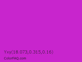 Yxy 18.073,0.315,0.16 Color is a normal magenta color and the nearest color is Steel Pink #cc33cc. Hex code #c825cd and RGB value is rgb(200,37,205). In RGB color space, this color is composed of 78% red, 15% green, 80% blue, In CMYK color space, this color is composed of 2% cyan, 82% magenta, 0% yellow , 20% black , In HSL color space, this color has a hue angle of 298° , 69% saturation and 47% lightness.