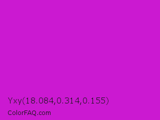 Yxy 18.084,0.314,0.155 Color is a normal magenta color and the nearest color is Deep Magenta #cc00cc. Hex code #cb19d1 and RGB value is rgb(203,25,209). In RGB color space, this color is composed of 80% red, 10% green, 82% blue, In CMYK color space, this color is composed of 3% cyan, 88% magenta, 0% yellow , 18% black , In HSL color space, this color has a hue angle of 298° , 79% saturation and 46% lightness.
