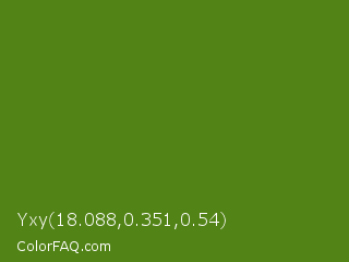 Yxy 18.088,0.351,0.54 Color is a dark green color and the nearest color is Vida Loca #549019. Hex code #528316 and RGB value is rgb(82,131,22). In RGB color space, this color is composed of 32% red, 51% green, 9% blue, In CMYK color space, this color is composed of 37% cyan, 0% magenta, 83% yellow , 49% black , In HSL color space, this color has a hue angle of 87° , 71% saturation and 30% lightness.