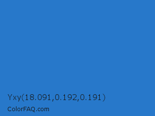 Yxy 18.091,0.192,0.191 Color is a normal blue color and the nearest color is Mariner #286acd. Hex code #2778ca and RGB value is rgb(39,120,202). In RGB color space, this color is composed of 15% red, 47% green, 79% blue, In CMYK color space, this color is composed of 81% cyan, 41% magenta, 0% yellow , 21% black , In HSL color space, this color has a hue angle of 210° , 68% saturation and 47% lightness.