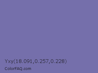 Yxy 18.091,0.257,0.228 Color is a normal indigo color and the nearest color is Deluge #7563a8. Hex code #756fab and RGB value is rgb(117,111,171). In RGB color space, this color is composed of 46% red, 44% green, 67% blue, In CMYK color space, this color is composed of 32% cyan, 35% magenta, 0% yellow , 33% black , In HSL color space, this color has a hue angle of 246° , 26% saturation and 55% lightness.