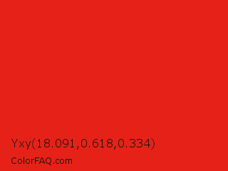 Yxy 18.091,0.618,0.334 Color is a normal red color and the nearest color is Lust #e62020. Hex code #e62218 and RGB value is rgb(230,34,24). In RGB color space, this color is composed of 90% red, 13% green, 9% blue, In CMYK color space, this color is composed of 0% cyan, 85% magenta, 90% yellow , 10% black , In HSL color space, this color has a hue angle of 3° , 81% saturation and 50% lightness.
