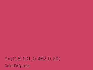 Yxy 18.101,0.482,0.29 Color is a normal red color and the nearest color is Dark Terra Cotta #cc4e5c. Hex code #cf4265 and RGB value is rgb(207,66,101). In RGB color space, this color is composed of 81% red, 26% green, 40% blue, In CMYK color space, this color is composed of 0% cyan, 68% magenta, 51% yellow , 19% black , In HSL color space, this color has a hue angle of 345° , 59% saturation and 54% lightness.