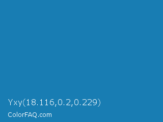 Yxy 18.116,0.2,0.229 Color is a normal blue color and the nearest color is Cyan Cornflower Blue #188bc2. Hex code #187db3 and RGB value is rgb(24,125,179). In RGB color space, this color is composed of 9% red, 49% green, 70% blue, In CMYK color space, this color is composed of 87% cyan, 30% magenta, 0% yellow , 30% black , In HSL color space, this color has a hue angle of 201° , 76% saturation and 40% lightness.