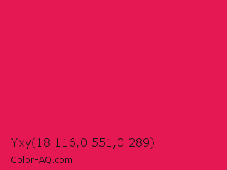 Yxy 18.116,0.551,0.289 Color is a normal rose color and the nearest color is Spanish Crimson #e51a4c. Hex code #e61854 and RGB value is rgb(230,24,84). In RGB color space, this color is composed of 90% red, 9% green, 33% blue, In CMYK color space, this color is composed of 0% cyan, 90% magenta, 63% yellow , 10% black , In HSL color space, this color has a hue angle of 343° , 81% saturation and 50% lightness.