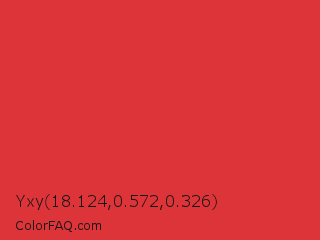 Yxy 18.124,0.572,0.326 Color is a normal red color and the nearest color is Jasper #d73b3e. Hex code #dd3439 and RGB value is rgb(221,52,57). In RGB color space, this color is composed of 87% red, 20% green, 22% blue, In CMYK color space, this color is composed of 0% cyan, 76% magenta, 74% yellow , 13% black , In HSL color space, this color has a hue angle of 358° , 71% saturation and 54% lightness.