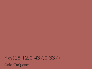 Yxy 18.12,0.437,0.337 Color is a normal red color and the nearest color is Matrix #b05d54. Hex code #ae605b and RGB value is rgb(174,96,91). In RGB color space, this color is composed of 68% red, 38% green, 36% blue, In CMYK color space, this color is composed of 0% cyan, 45% magenta, 48% yellow , 32% black , In HSL color space, this color has a hue angle of 4° , 34% saturation and 52% lightness.