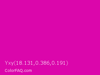 Yxy 18.131,0.386,0.191 Color is a normal magenta color and the nearest color is Hollywood Cerise #f400a1. Hex code #db06ab and RGB value is rgb(219,6,171). In RGB color space, this color is composed of 86% red, 2% green, 67% blue, In CMYK color space, this color is composed of 0% cyan, 97% magenta, 22% yellow , 14% black , In HSL color space, this color has a hue angle of 314° , 95% saturation and 44% lightness.