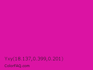 Yxy 18.137,0.399,0.201 Color is a normal magenta color and the nearest color is Barbie Pink #e0218a. Hex code #db13a3 and RGB value is rgb(219,19,163). In RGB color space, this color is composed of 86% red, 7% green, 64% blue, In CMYK color space, this color is composed of 0% cyan, 91% magenta, 26% yellow , 14% black , In HSL color space, this color has a hue angle of 317° , 84% saturation and 47% lightness.