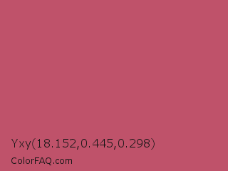 Yxy 18.152,0.445,0.298 Color is a normal red color and the nearest color is Popstar #be4f62. Hex code #bf526a and RGB value is rgb(191,82,106). In RGB color space, this color is composed of 75% red, 32% green, 42% blue, In CMYK color space, this color is composed of 0% cyan, 57% magenta, 45% yellow , 25% black , In HSL color space, this color has a hue angle of 347° , 46% saturation and 54% lightness.