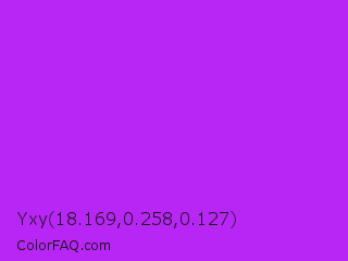 Yxy 18.169,0.258,0.127 Color is a normal purple color and the nearest color is Veronica #a020f0. Hex code #b826f5 and RGB value is rgb(184,38,245). In RGB color space, this color is composed of 72% red, 15% green, 96% blue, In CMYK color space, this color is composed of 25% cyan, 84% magenta, 0% yellow , 4% black , In HSL color space, this color has a hue angle of 282° , 91% saturation and 55% lightness.