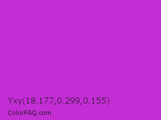 Yxy 18.177,0.299,0.155 Color is a normal magenta color and the nearest color is Steel Pink #cc33cc. Hex code #c22ed4 and RGB value is rgb(194,46,212). In RGB color space, this color is composed of 76% red, 18% green, 83% blue, In CMYK color space, this color is composed of 8% cyan, 78% magenta, 0% yellow , 17% black , In HSL color space, this color has a hue angle of 293° , 66% saturation and 51% lightness.