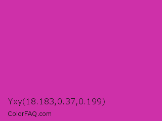 Yxy 18.183,0.37,0.199 Color is a normal magenta color and the nearest color is Byzantine #bd33a4. Hex code #ce30a9 and RGB value is rgb(206,48,169). In RGB color space, this color is composed of 81% red, 19% green, 66% blue, In CMYK color space, this color is composed of 0% cyan, 77% magenta, 18% yellow , 19% black , In HSL color space, this color has a hue angle of 314° , 62% saturation and 50% lightness.