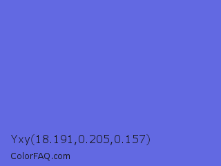 Yxy 18.191,0.205,0.157 Color is a light blue color and the nearest color is Majorelle Blue #6050dc. Hex code #6269e2 and RGB value is rgb(98,105,226). In RGB color space, this color is composed of 38% red, 41% green, 89% blue, In CMYK color space, this color is composed of 57% cyan, 54% magenta, 0% yellow , 11% black , In HSL color space, this color has a hue angle of 237° , 69% saturation and 64% lightness.