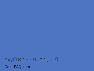 Yxy 18.195,0.211,0.2 Color is a normal blue color and the nearest color is Indigo #4f69c6. Hex code #4e75c2 and RGB value is rgb(78,117,194). In RGB color space, this color is composed of 31% red, 46% green, 76% blue, In CMYK color space, this color is composed of 60% cyan, 40% magenta, 0% yellow , 24% black , In HSL color space, this color has a hue angle of 220° , 49% saturation and 53% lightness.