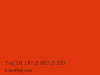 Yxy 18.197,0.607,0.35 Color is a normal red color and the nearest color is Vermilion #d9381e. Hex code #de360d and RGB value is rgb(222,54,13). In RGB color space, this color is composed of 87% red, 21% green, 5% blue, In CMYK color space, this color is composed of 0% cyan, 76% magenta, 94% yellow , 13% black , In HSL color space, this color has a hue angle of 12° , 89% saturation and 46% lightness.