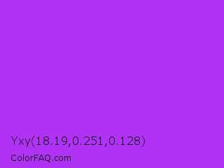 Yxy 18.19,0.251,0.128 Color is a normal purple color and the nearest color is Veronica #a020f0. Hex code #b032f5 and RGB value is rgb(176,50,245). In RGB color space, this color is composed of 69% red, 20% green, 96% blue, In CMYK color space, this color is composed of 28% cyan, 80% magenta, 0% yellow , 4% black , In HSL color space, this color has a hue angle of 279° , 91% saturation and 58% lightness.