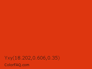 Yxy 18.202,0.606,0.35 Color is a normal red color and the nearest color is Vermilion #d9381e. Hex code #de360f and RGB value is rgb(222,54,15). In RGB color space, this color is composed of 87% red, 21% green, 6% blue, In CMYK color space, this color is composed of 0% cyan, 76% magenta, 93% yellow , 13% black , In HSL color space, this color has a hue angle of 11° , 87% saturation and 46% lightness.