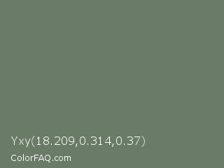 Yxy 18.209,0.314,0.37 Color is a normal green color and the nearest color is Limed Ash #747d63. Hex code #6a7b67 and RGB value is rgb(106,123,103). In RGB color space, this color is composed of 42% red, 48% green, 40% blue, In CMYK color space, this color is composed of 14% cyan, 0% magenta, 16% yellow , 52% black , In HSL color space, this color has a hue angle of 111° , 9% saturation and 44% lightness.