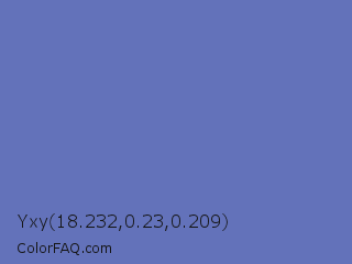 Yxy 18.232,0.23,0.209 Color is a normal blue color and the nearest color is Glaucous #6082b6. Hex code #6372ba and RGB value is rgb(99,114,186). In RGB color space, this color is composed of 39% red, 45% green, 73% blue, In CMYK color space, this color is composed of 47% cyan, 39% magenta, 0% yellow , 27% black , In HSL color space, this color has a hue angle of 230° , 39% saturation and 56% lightness.