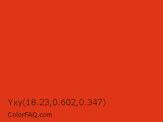 Yxy 18.23,0.602,0.347 Color is a normal red color and the nearest color is Vermilion #d9381e. Hex code #de3617 and RGB value is rgb(222,54,23). In RGB color space, this color is composed of 87% red, 21% green, 9% blue, In CMYK color space, this color is composed of 0% cyan, 76% magenta, 90% yellow , 13% black , In HSL color space, this color has a hue angle of 9° , 81% saturation and 48% lightness.