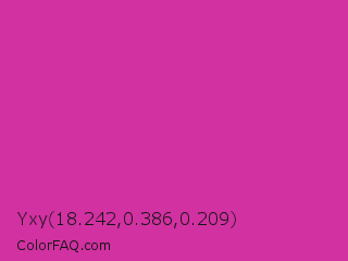 Yxy 18.242,0.386,0.209 Color is a normal magenta color and the nearest color is Royal Fuchsia #ca2c92. Hex code #d131a1 and RGB value is rgb(209,49,161). In RGB color space, this color is composed of 82% red, 19% green, 63% blue, In CMYK color space, this color is composed of 0% cyan, 77% magenta, 23% yellow , 18% black , In HSL color space, this color has a hue angle of 318° , 63% saturation and 51% lightness.