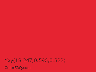 Yxy 18.247,0.596,0.322 Color is a normal red color and the nearest color is Alizarin Crimson #e32636. Hex code #e62331 and RGB value is rgb(230,35,49). In RGB color space, this color is composed of 90% red, 14% green, 19% blue, In CMYK color space, this color is composed of 0% cyan, 85% magenta, 79% yellow , 10% black , In HSL color space, this color has a hue angle of 356° , 80% saturation and 52% lightness.