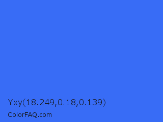 Yxy 18.249,0.18,0.139 Color is a normal blue color and the nearest color is Ultramarine Blue #4166f5. Hex code #386cf6 and RGB value is rgb(56,108,246). In RGB color space, this color is composed of 22% red, 42% green, 96% blue, In CMYK color space, this color is composed of 77% cyan, 56% magenta, 0% yellow , 4% black , In HSL color space, this color has a hue angle of 224° , 91% saturation and 59% lightness.
