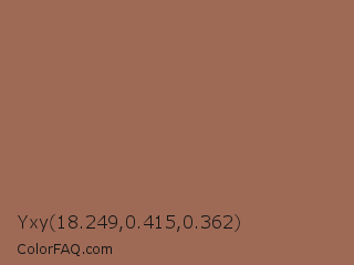 Yxy 18.249,0.415,0.362 Color is a normal orange color and the nearest color is Leather #967059. Hex code #9e6a56 and RGB value is rgb(158,106,86). In RGB color space, this color is composed of 62% red, 42% green, 34% blue, In CMYK color space, this color is composed of 0% cyan, 33% magenta, 46% yellow , 38% black , In HSL color space, this color has a hue angle of 17° , 30% saturation and 48% lightness.