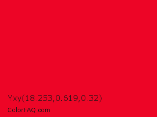 Yxy 18.253,0.619,0.32 Color is a normal red color and the nearest color is Spanish Red #e60026. Hex code #ed0526 and RGB value is rgb(237,5,38). In RGB color space, this color is composed of 93% red, 2% green, 15% blue, In CMYK color space, this color is composed of 0% cyan, 98% magenta, 84% yellow , 7% black , In HSL color space, this color has a hue angle of 351° , 96% saturation and 47% lightness.