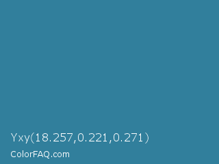 Yxy 18.257,0.221,0.271 Color is a normal blue color and the nearest color is Astral #327da0. Hex code #317f9c and RGB value is rgb(49,127,156). In RGB color space, this color is composed of 19% red, 50% green, 61% blue, In CMYK color space, this color is composed of 69% cyan, 19% magenta, 0% yellow , 39% black , In HSL color space, this color has a hue angle of 196° , 52% saturation and 40% lightness.