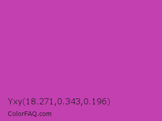 Yxy 18.271,0.343,0.196 Color is a normal magenta color and the nearest color is Byzantine #bd33a4. Hex code #c240b0 and RGB value is rgb(194,64,176). In RGB color space, this color is composed of 76% red, 25% green, 69% blue, In CMYK color space, this color is composed of 0% cyan, 67% magenta, 9% yellow , 24% black , In HSL color space, this color has a hue angle of 308° , 52% saturation and 51% lightness.