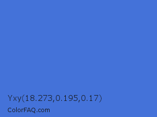 Yxy 18.273,0.195,0.17 Color is a normal blue color and the nearest color is Han Blue #446ccf. Hex code #4472d9 and RGB value is rgb(68,114,217). In RGB color space, this color is composed of 27% red, 45% green, 85% blue, In CMYK color space, this color is composed of 69% cyan, 47% magenta, 0% yellow , 15% black , In HSL color space, this color has a hue angle of 221° , 66% saturation and 56% lightness.