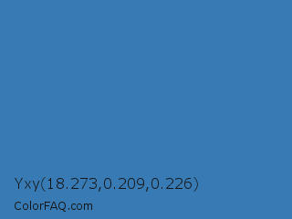 Yxy 18.273,0.209,0.226 Color is a normal blue color and the nearest color is Steel Blue #4682b4. Hex code #387bb4 and RGB value is rgb(56,123,180). In RGB color space, this color is composed of 22% red, 48% green, 71% blue, In CMYK color space, this color is composed of 69% cyan, 32% magenta, 0% yellow , 29% black , In HSL color space, this color has a hue angle of 208° , 53% saturation and 46% lightness.