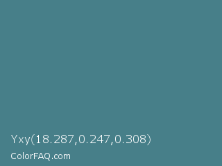 Yxy 18.287,0.247,0.308 Color is a normal cyan color and the nearest color is Smalt Blue #51808f. Hex code #477f89 and RGB value is rgb(71,127,137). In RGB color space, this color is composed of 28% red, 50% green, 54% blue, In CMYK color space, this color is composed of 48% cyan, 7% magenta, 0% yellow , 46% black , In HSL color space, this color has a hue angle of 189° , 32% saturation and 41% lightness.