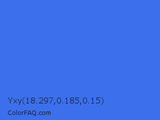 Yxy 18.297,0.185,0.15 Color is a normal blue color and the nearest color is Royal Blue #4169e1. Hex code #3c6feb and RGB value is rgb(60,111,235). In RGB color space, this color is composed of 24% red, 44% green, 92% blue, In CMYK color space, this color is composed of 74% cyan, 53% magenta, 0% yellow , 8% black , In HSL color space, this color has a hue angle of 223° , 81% saturation and 58% lightness.