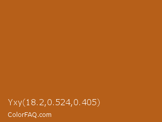 Yxy 18.2,0.524,0.405 Color is a normal orange color and the nearest color is Light Brown #b5651d. Hex code #b65f19 and RGB value is rgb(182,95,25). In RGB color space, this color is composed of 71% red, 37% green, 10% blue, In CMYK color space, this color is composed of 0% cyan, 48% magenta, 86% yellow , 29% black , In HSL color space, this color has a hue angle of 27° , 76% saturation and 41% lightness.