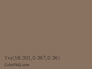 Yxy 18.301,0.367,0.36 Color is a normal orange color and the nearest color is Cement #8d7662. Hex code #8a7261 and RGB value is rgb(138,114,97). In RGB color space, this color is composed of 54% red, 45% green, 38% blue, In CMYK color space, this color is composed of 0% cyan, 17% magenta, 30% yellow , 46% black , In HSL color space, this color has a hue angle of 25° , 17% saturation and 46% lightness.