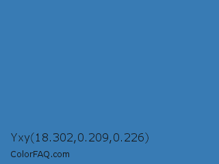 Yxy 18.302,0.209,0.226 Color is a normal blue color and the nearest color is Steel Blue #4682b4. Hex code #387bb4 and RGB value is rgb(56,123,180). In RGB color space, this color is composed of 22% red, 48% green, 71% blue, In CMYK color space, this color is composed of 69% cyan, 32% magenta, 0% yellow , 29% black , In HSL color space, this color has a hue angle of 208° , 53% saturation and 46% lightness.