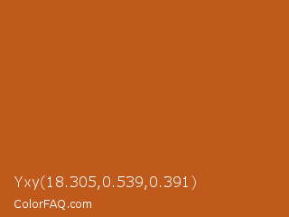 Yxy 18.305,0.539,0.391 Color is a normal orange color and the nearest color is Orange Roughy #c45719. Hex code #bf591c and RGB value is rgb(191,89,28). In RGB color space, this color is composed of 75% red, 35% green, 11% blue, In CMYK color space, this color is composed of 0% cyan, 53% magenta, 85% yellow , 25% black , In HSL color space, this color has a hue angle of 22° , 74% saturation and 43% lightness.