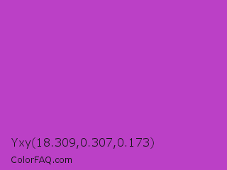 Yxy 18.309,0.307,0.173 Color is a normal magenta color and the nearest color is Fuchsia Pink #c154c1. Hex code #bb40c6 and RGB value is rgb(187,64,198). In RGB color space, this color is composed of 73% red, 25% green, 78% blue, In CMYK color space, this color is composed of 6% cyan, 68% magenta, 0% yellow , 22% black , In HSL color space, this color has a hue angle of 295° , 54% saturation and 51% lightness.