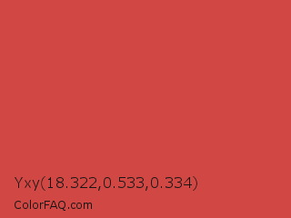 Yxy 18.322,0.533,0.334 Color is a normal red color and the nearest color is English Vermillion #cc474b. Hex code #d04743 and RGB value is rgb(208,71,67). In RGB color space, this color is composed of 82% red, 28% green, 26% blue, In CMYK color space, this color is composed of 0% cyan, 66% magenta, 68% yellow , 18% black , In HSL color space, this color has a hue angle of 2° , 60% saturation and 54% lightness.