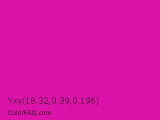 Yxy 18.32,0.39,0.196 Color is a normal magenta color and the nearest color is Hollywood Cerise #f400a1. Hex code #db13a8 and RGB value is rgb(219,19,168). In RGB color space, this color is composed of 86% red, 7% green, 66% blue, In CMYK color space, this color is composed of 0% cyan, 91% magenta, 23% yellow , 14% black , In HSL color space, this color has a hue angle of 315° , 84% saturation and 47% lightness.
