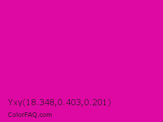 Yxy 18.348,0.403,0.201 Color is a normal magenta color and the nearest color is Hollywood Cerise #f400a1. Hex code #de09a3 and RGB value is rgb(222,9,163). In RGB color space, this color is composed of 87% red, 4% green, 64% blue, In CMYK color space, this color is composed of 0% cyan, 96% magenta, 27% yellow , 13% black , In HSL color space, this color has a hue angle of 317° , 92% saturation and 45% lightness.