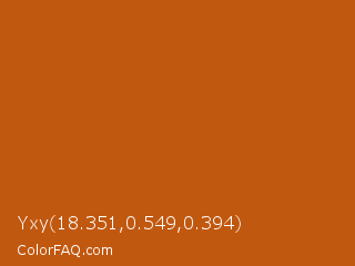 Yxy 18.351,0.549,0.394 Color is a normal orange color and the nearest color is Orange Roughy #c45719. Hex code #c1580f and RGB value is rgb(193,88,15). In RGB color space, this color is composed of 76% red, 35% green, 6% blue, In CMYK color space, this color is composed of 0% cyan, 54% magenta, 92% yellow , 24% black , In HSL color space, this color has a hue angle of 25° , 86% saturation and 41% lightness.