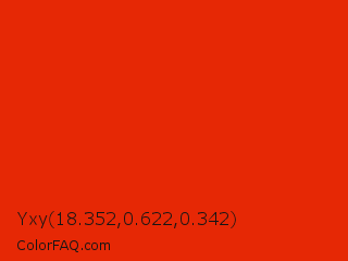 Yxy 18.352,0.622,0.342 Color is a normal red color and the nearest color is Ferrari Red #ff2800. Hex code #e62805 and RGB value is rgb(230,40,5). In RGB color space, this color is composed of 90% red, 16% green, 2% blue, In CMYK color space, this color is composed of 0% cyan, 83% magenta, 98% yellow , 10% black , In HSL color space, this color has a hue angle of 9° , 96% saturation and 46% lightness.