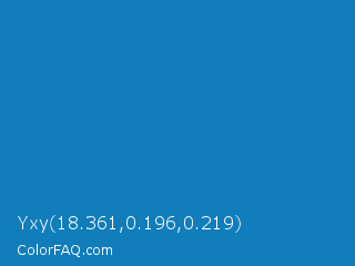 Yxy 18.361,0.196,0.219 Color is a normal blue color and the nearest color is Star Command Blue #007bb8. Hex code #117dba and RGB value is rgb(17,125,186). In RGB color space, this color is composed of 7% red, 49% green, 73% blue, In CMYK color space, this color is composed of 91% cyan, 33% magenta, 0% yellow , 27% black , In HSL color space, this color has a hue angle of 202° , 83% saturation and 40% lightness.