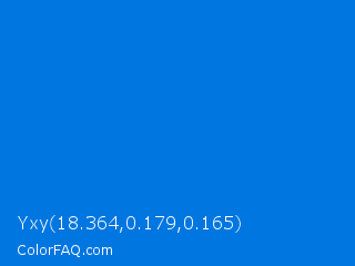 Yxy 18.364,0.179,0.165 Color is a normal blue color and the nearest color is True Blue #0073cf. Hex code #0076e0 and RGB value is rgb(0,118,224). In RGB color space, this color is composed of 0% red, 46% green, 88% blue, In CMYK color space, this color is composed of 100% cyan, 47% magenta, 0% yellow , 12% black , In HSL color space, this color has a hue angle of 208° , 100% saturation and 44% lightness.