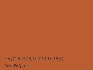 Yxy 18.373,0.509,0.382 Color is a normal orange color and the nearest color is Tuscany #bd5e2e. Hex code #b95d32 and RGB value is rgb(185,93,50). In RGB color space, this color is composed of 73% red, 36% green, 20% blue, In CMYK color space, this color is composed of 0% cyan, 50% magenta, 73% yellow , 27% black , In HSL color space, this color has a hue angle of 19° , 57% saturation and 46% lightness.