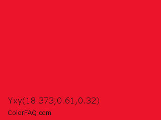 Yxy 18.373,0.61,0.32 Color is a normal red color and the nearest color is Red Pigment #ed1c24. Hex code #eb142b and RGB value is rgb(235,20,43). In RGB color space, this color is composed of 92% red, 8% green, 17% blue, In CMYK color space, this color is composed of 0% cyan, 91% magenta, 82% yellow , 8% black , In HSL color space, this color has a hue angle of 354° , 84% saturation and 50% lightness.